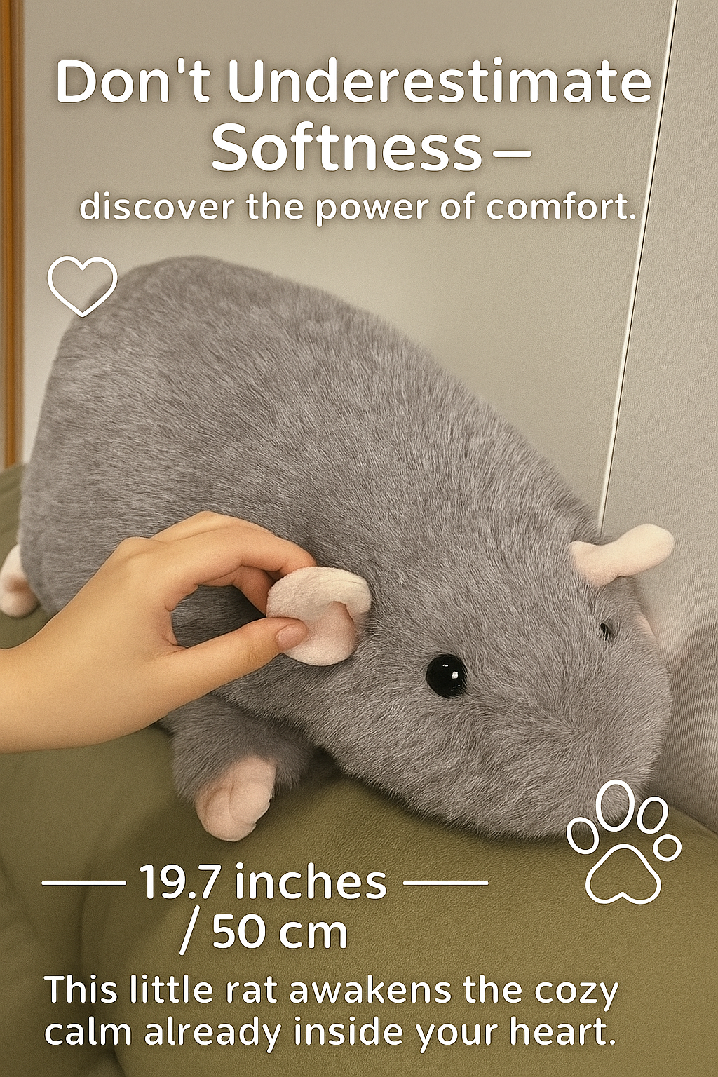 A 50 cm Cute Fluffy Rat β a super-soft plush made to bring warmth, comfort, and calm to everyday life.